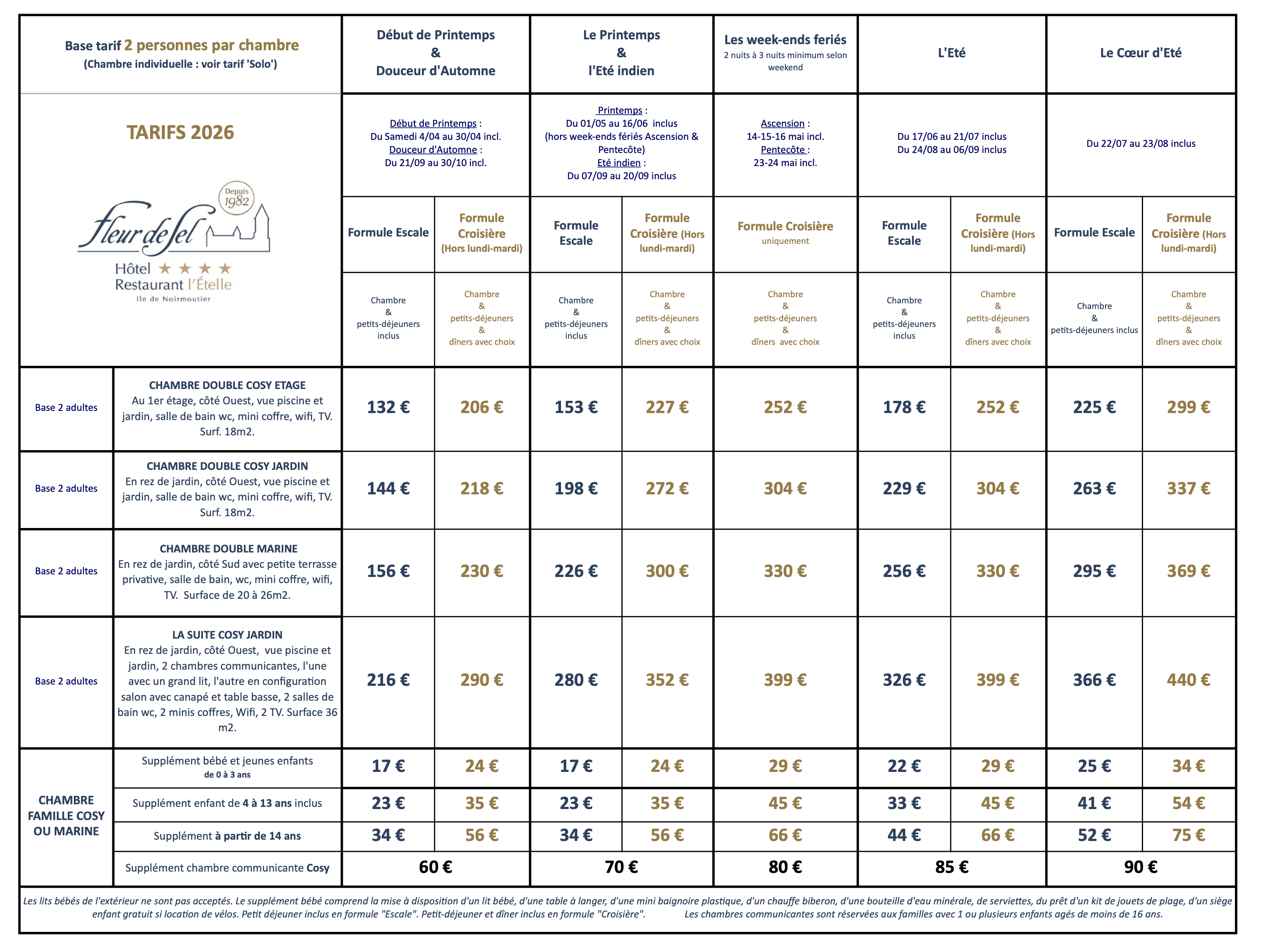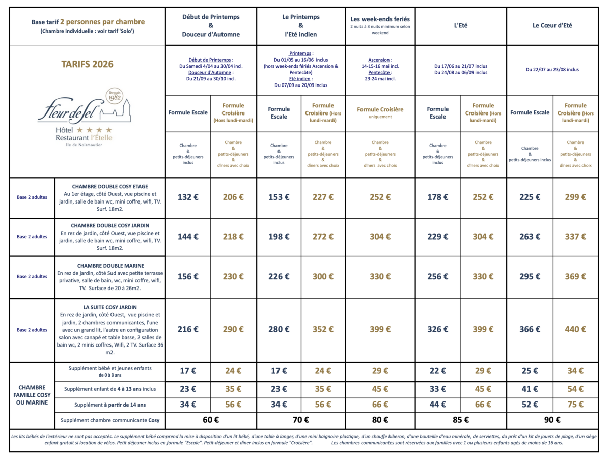Découvrez nos tarifs en détail, adaptés à chaque saison et à nos différentes catégories de chambres. Que vous voyagiez en basse, moyenne ou haute saison, ou que vous préfériez une chambre classique ou une suite, nous avons pensé à tout pour répondre à vos envies et votre budget.
